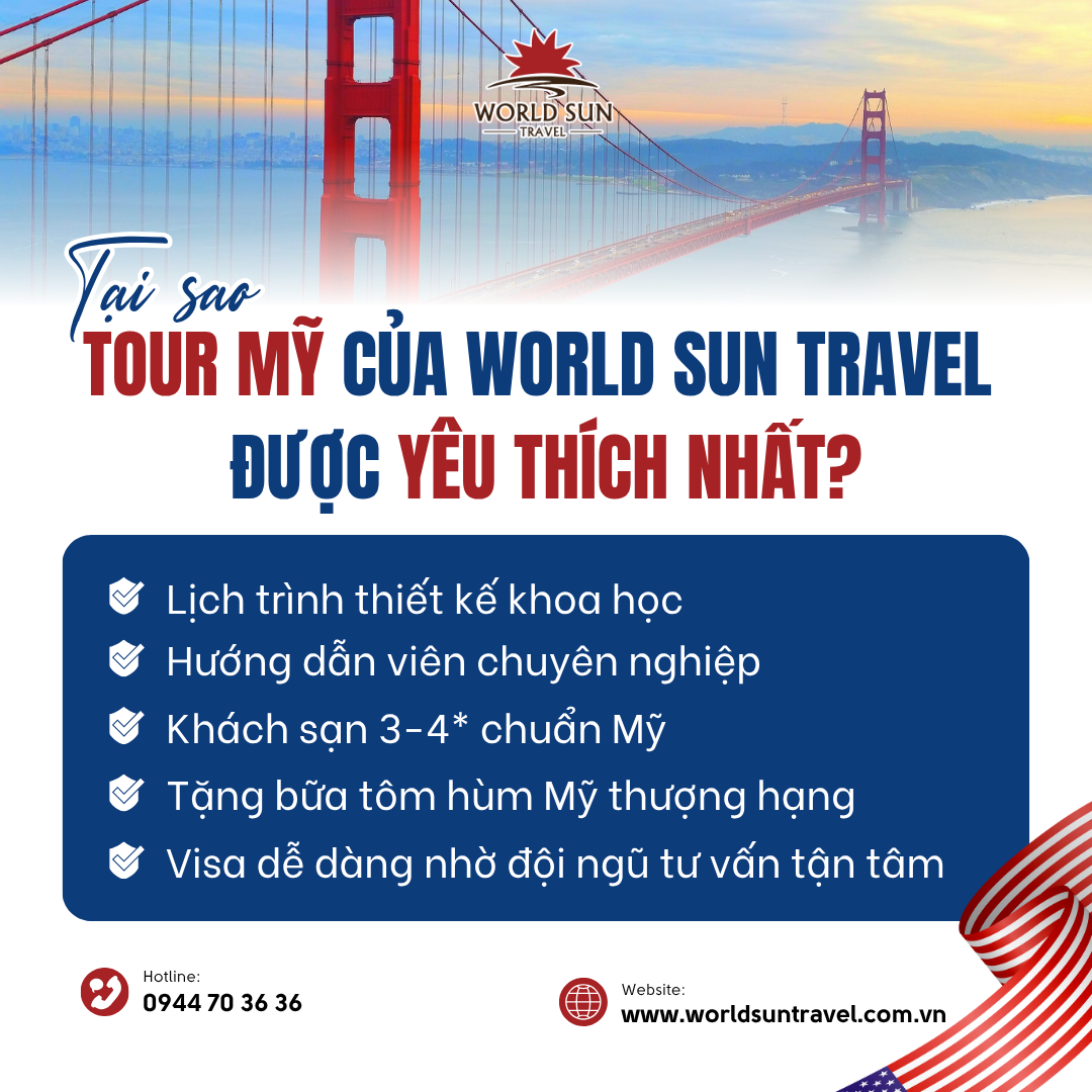 Với hơn 15 năm kinh nghiệm tổ chức tour Mỹ, World Sun Travel tự hào là lựa chọn hàng đầu của hàng ngàn du khách mỗi năm. Chúng tôi không chỉ mang đến một chuyến đi tham quan đơn thuần, mà còn là hành trình trải nghiệm đẳng cấp, nơi mỗi khoảnh khắc đều được chăm chút tỉ mỉ từ lịch trình, dịch vụ lưu trú, đến ẩm thực và visa.